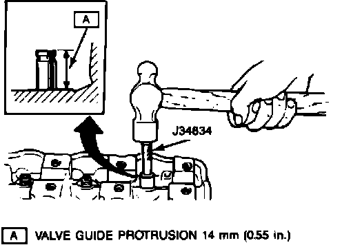 c. Install valve guides by heating cylinder head uniformly at a temperature of 176-212°F to prevent head distortion. Using valve guide installation tool No. J34834, drive valve guide into cylinder head leaving a .55 inch protrusion above the cylinder head, Fig. 15.