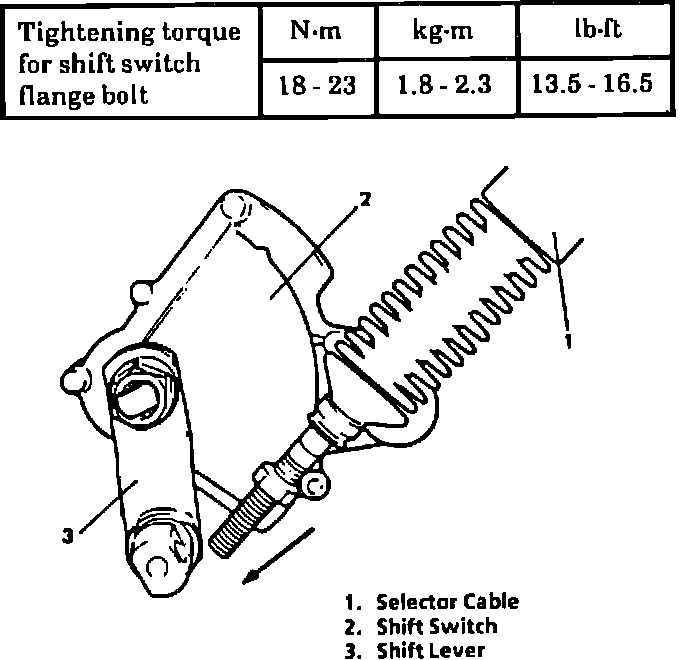 4. Set shift lever to "N" range position and remove shift switch flange bolt. After turning shift lever switch completely clockwise, turn it counterclockwise gradually until restriction is felt, and tighten flange bolt there.