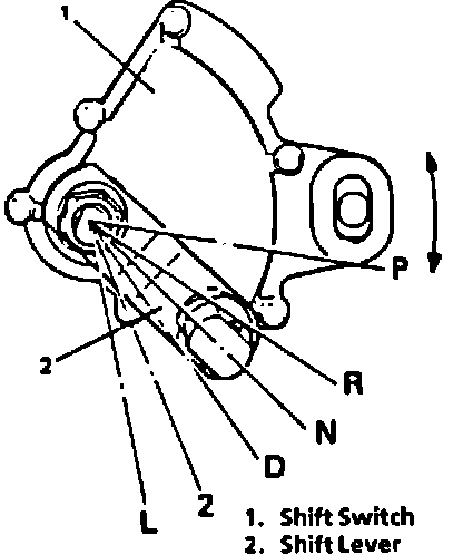 5. Perform continuity check as described in "Shift Switch" test procedure, under SPECIFICATIONS, ELECTRICAL AND ELECTRONIC SPECIFICATIONS. But this time, move shift lever from "P" to "L" and "L" to "P" range position instead of shifting selector lever and check for continuity between each terminal. If check result is not satisfactory, replace shift lever switch.