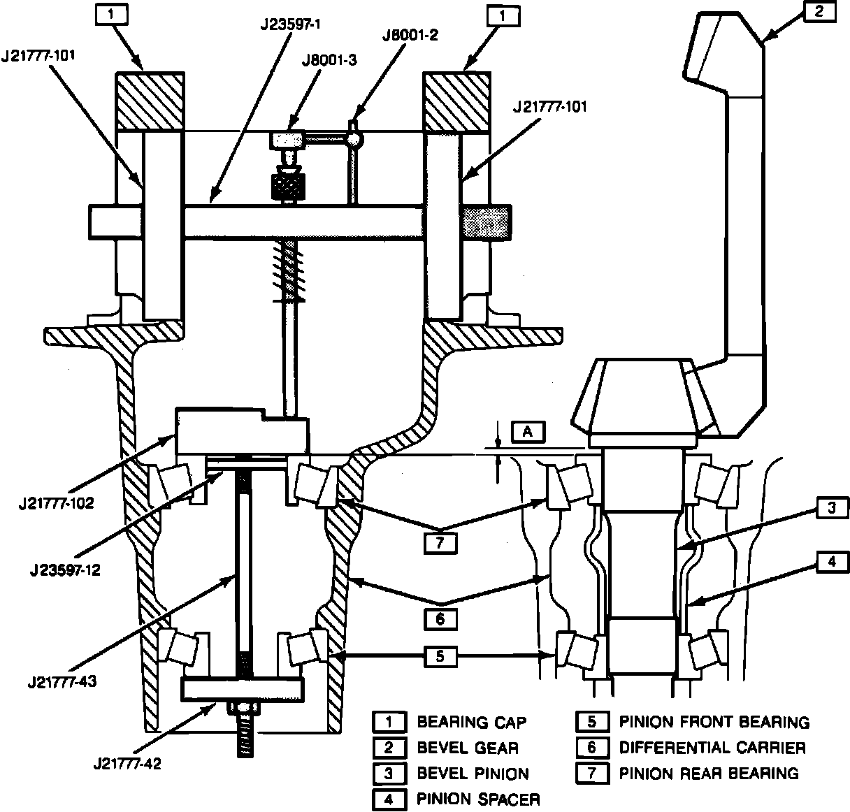 14. Install pinion setting gauge tool No. J23597, or equivalent and assemble the gauge shaft in the carrier so that the dial indicator rod is centered on the gauging area of the gauge block.
