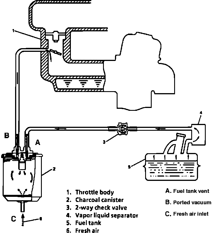 An evaporative emission control system is used to prevent emission of fuel vapor. The vapors generated in the fuel tank while driving or while the engine is not running, passes through a 2-way check valve and enters the charcoal canister where the charcoal absorbs and stores the fuel vapor. While the engine is running, the fuel vapor stored in the canister is drawn into the intake manifold together with fresh air to be burned. While the engine is not running, the fuel vapor is stored in the canister.