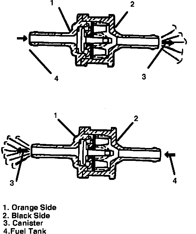 The 2-way check valve is provided to keep the pressure in the fuel tank constant. When the pressure in the fuel tank becomes positive and reaches its specified value, it opens the valve to let the vapor flow into the charcoal canister. On the other hand, when the pressure in the fuel tank becomes negative and reaches its specified value, it opens the valve to let the air flow into the fuel tank.