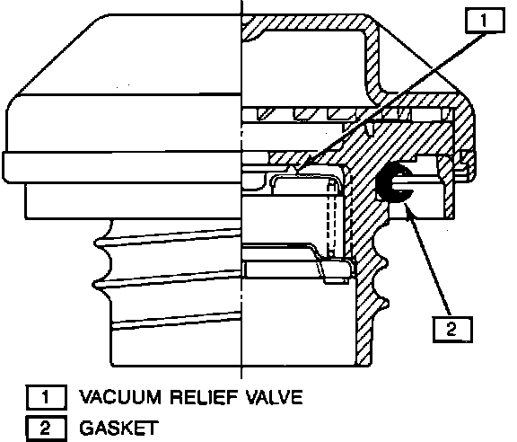 A ratchet tightening device on the threaded fuel filler cap reduces the chances of incorrect installation, which would prevent sealing of fuel vapors. After the gasket on the fuel filler cap makes contact with the fuel filler neck flange, a loud clicking noise is heard, indicating that the seal has been set. The cap used on this vehicle has a vacuum relief valve incorporated into it. If the pressure in the fuel tank becomes negative (vacuum), the relief valve opens to release the pressure created within the fuel tank. Only when vacuum becomes excessive within the tank does this occur. Normally, vacuum pressure is relieved by a two-way check valve which is incorporated into the fuel vapor line.