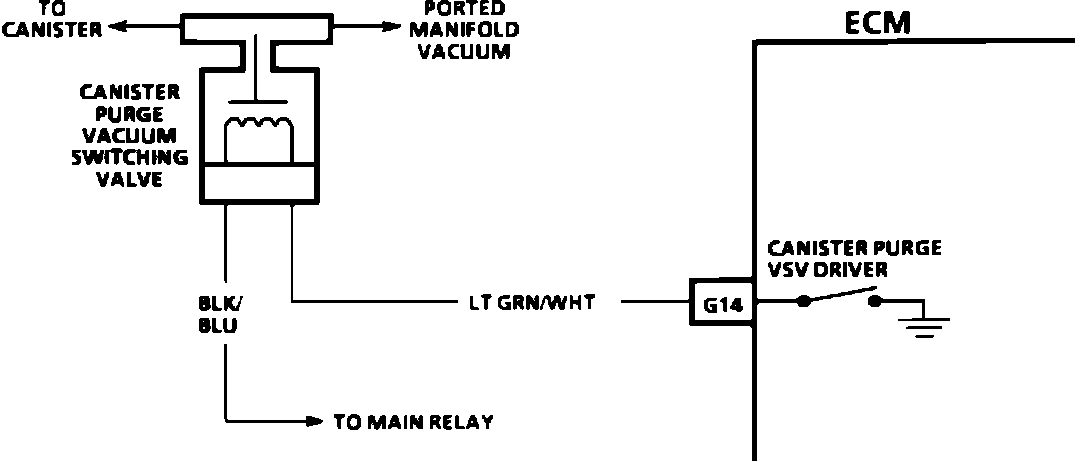 Canister purge is controlled by a solenoid that allows manifold and/or ported vacuum to purge the canister when energized. The Electronic Control Module (ECM) supplies a ground to energize the solenoid (purge "ON"). The purge solenoid control by the ECM is turned "ON" or "OFF" under specific engine conditions. The purge solenoid is turned "ON" when all of the following conditions are met: