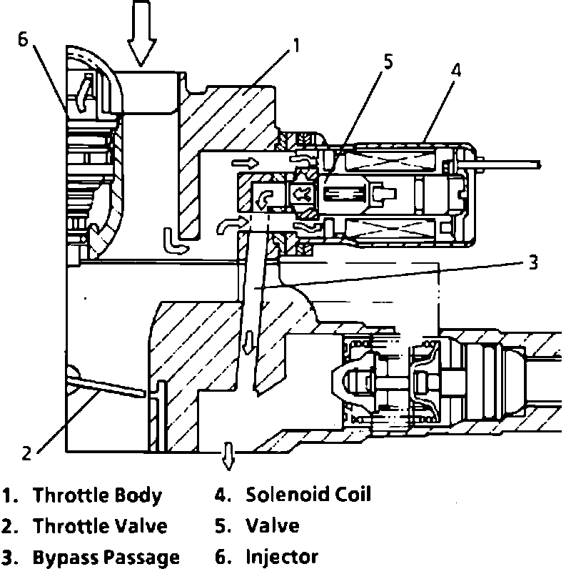A sudden change in the throttle valve opening (especially when decelerating) causes the air/fuel mixture ratio to change suddenly. To compensate for this condition, the bypass air flow will be increased or decreased depending on condition. By increasing or decreasing the air, the air/fuel mixture ratio is changed gradually and dashpot effect is obtained. The air is increased when throttle is opened and decreased when the throttle is closed.