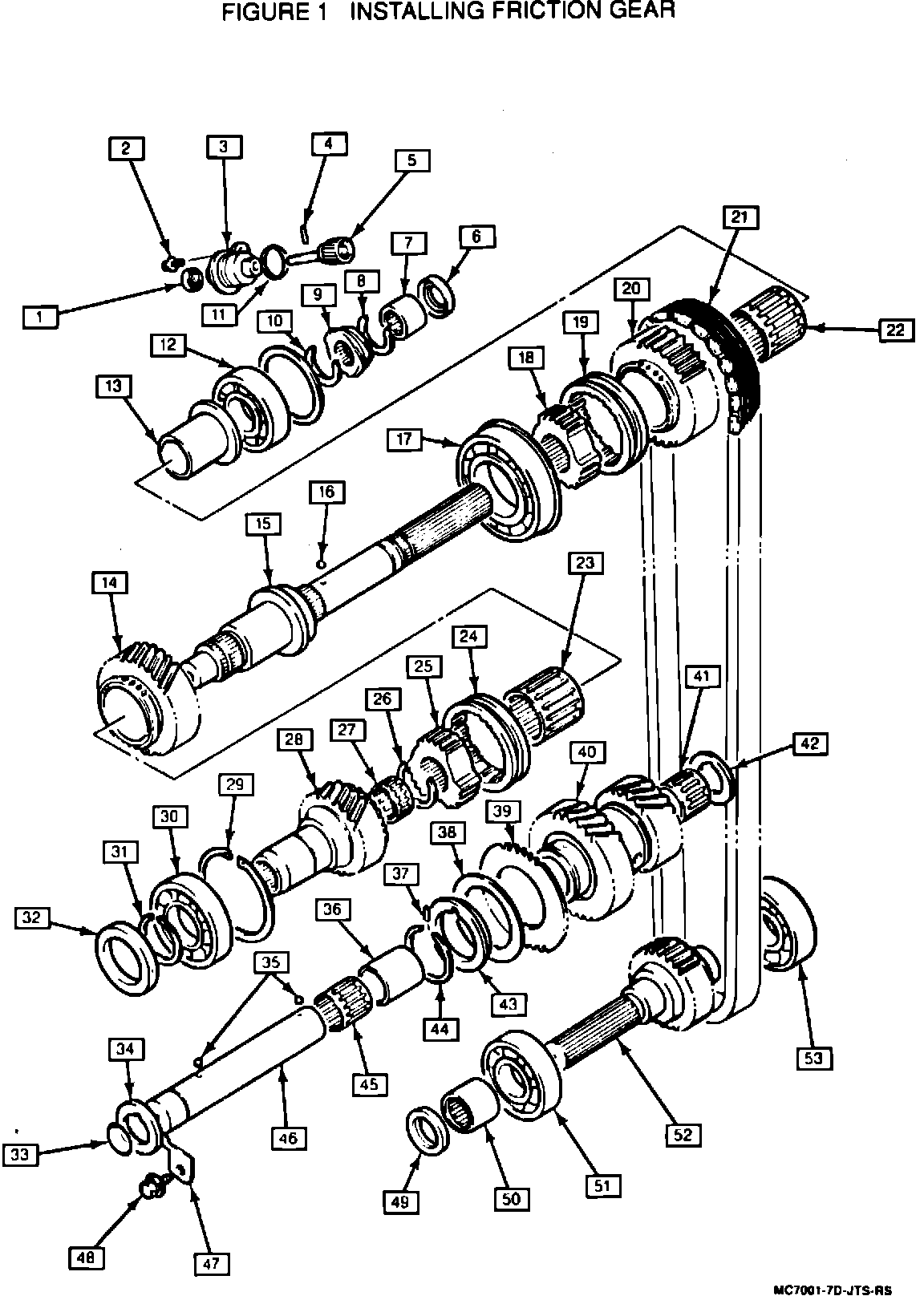 Install the pin, friction gear, friction gear spring, friction gear retainer and the C-clip to the counter shaft (Figure 1).