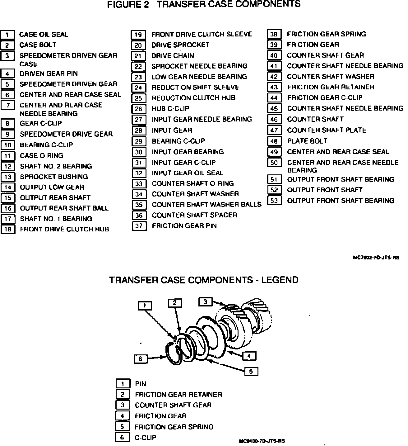 Figures 2 and 3 of this bulletin replace Figure 2 found on page 7D-3. In addition, the Transfer Case Unit Repair disassembly and assembly procedures have been corrected.