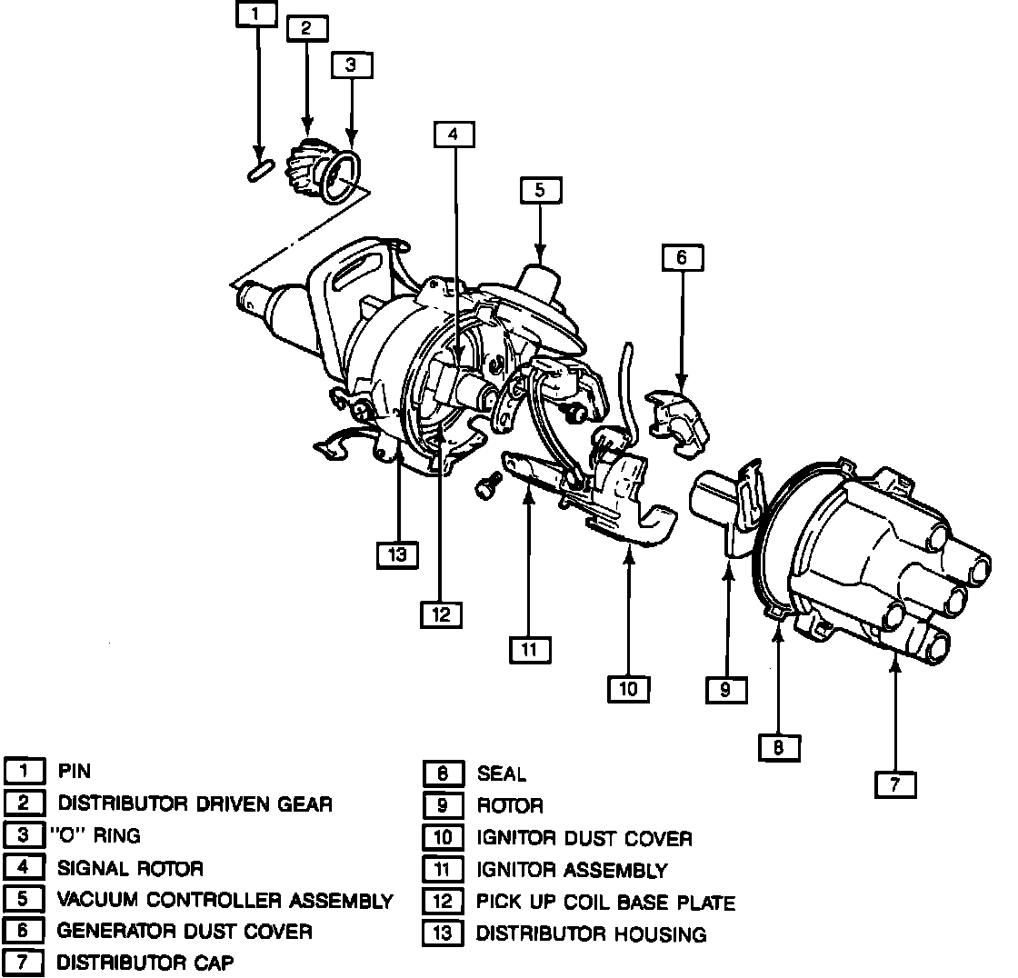 All spark timing changes in the distributor are performed electronically by the ECM. The ECM monitors information from various engine sensors, computes the desired spark timing and signals the distributor to change the timing accordingly. No vacuum or mechanical advance mechanisms are used on this system.