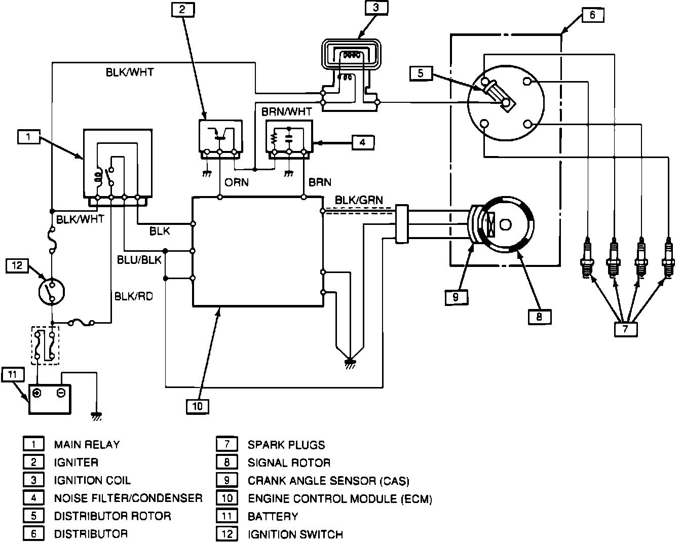 The basic components of this ignition system are the ignition coil, the distributor, the spark plugs, and the spark plug wiring. The distributor consists of a signal generator (signal rotor and pickup coil) and ignitor.