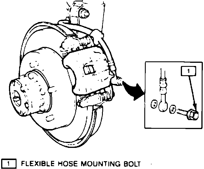 3. Remove brake line, caliper bolts, then the caliper. Hang caliper with a wire hook or equivalent, to prevent brake hose from bending or twisting excessively. Do not depress brake pedal with pads removed.