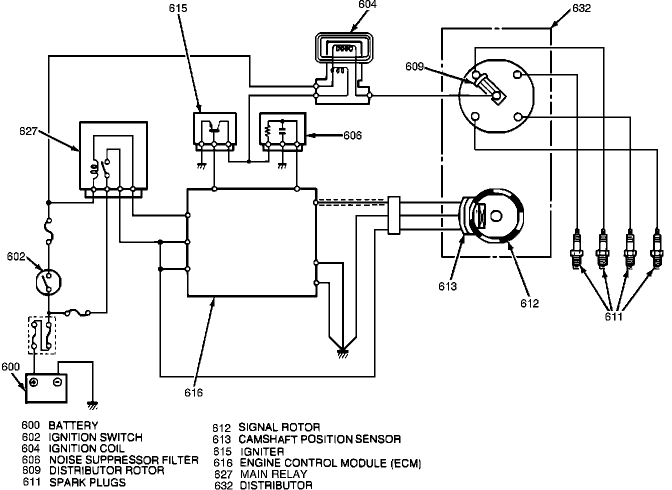 All spark timing changes in the distributor are performed electronically by the ECM. The ECM monitors information from various engine sensors, computes the desired spark timing and signals the distributor to change the timing accordingly. No vacuum or mechanical advance mechanisms are used on this system.