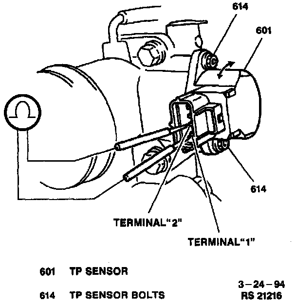 A. Connect a DVOM to TP sensor connector terminal "1" to "2" (TP sensor side). Measure resistance.