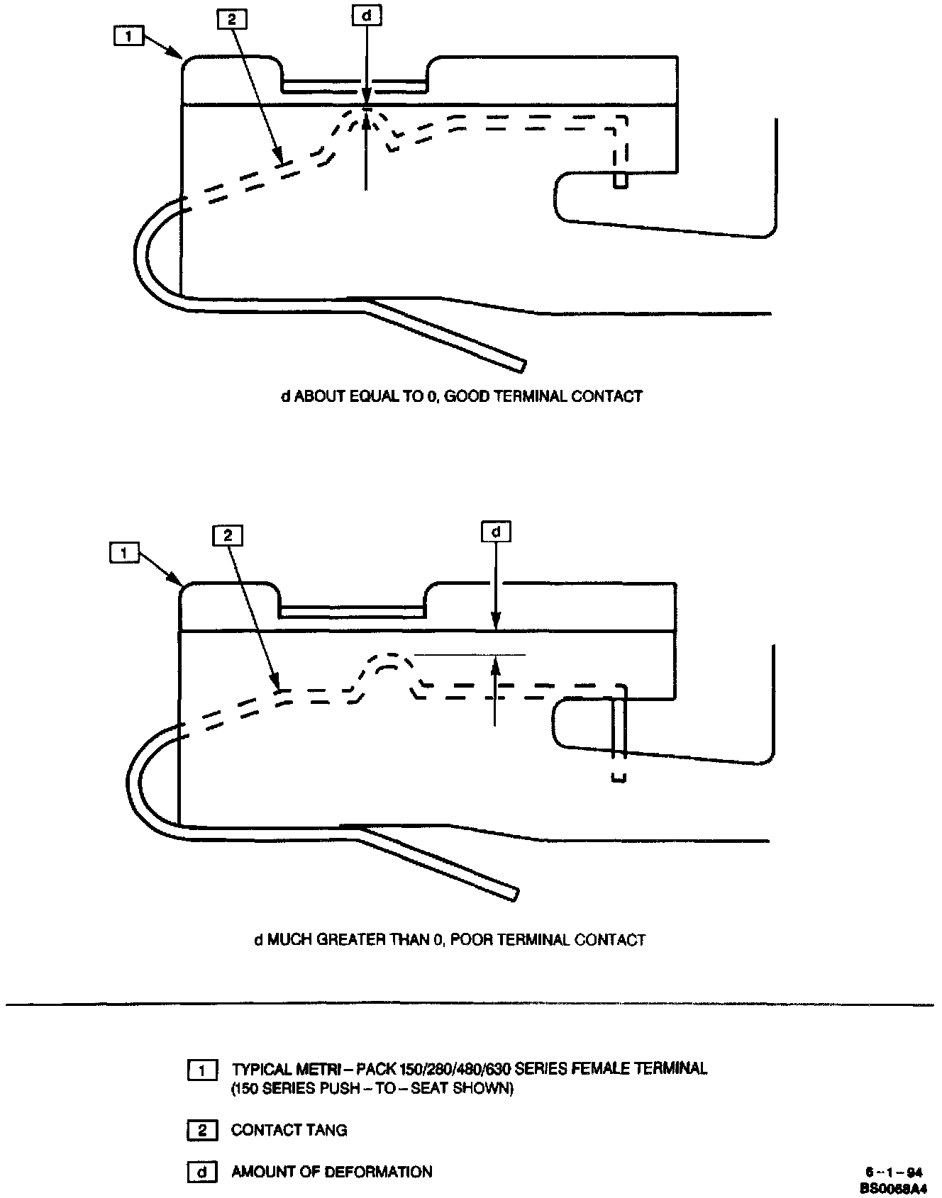 Deformation is caused by probing the mating side of a connector terminal without the proper adapter, improperly joining the connector halves or repeatedly separating and joining the connector halves. Deformation, usually to the female terminal contact tang, can result in poor terminal contact, causing an open or intermittently open circuit.