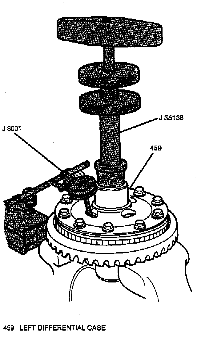 1. Left differential side gear end play using J 8001 and J 35138. Insert the J 35138 in through the left axle shaft differential case bore and adjust until the J 35138 has a firm grasp on the left differential side gear. Then, move J 35138 up and down while observing the J 8001. Left differential side gear end play should measure 12 to 37 mm (0.005 to 0.014 inch). If left differential side gear end play is too high or low, replace the selective shim with the appropriate size to obtain correct end play.