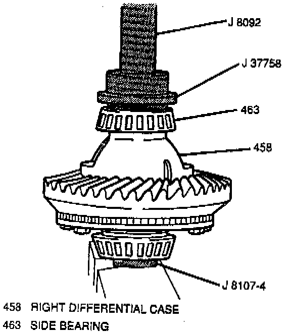 ^ Right differential side bearing on the right side of the differential case assembly using J 37758 with J 8092. Place the differential case assembly on a hydraulic press and using J 8107-4 for support. Then, using the J 37759 with the J 8092, place the right differential side bearing on the right differential case with the taper side up and slowly press the right differential side bearing onto the right differential case.