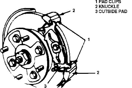 5. Install pad clips, No. 1 & 2, then outside pad to knuckle, Fig. 3.