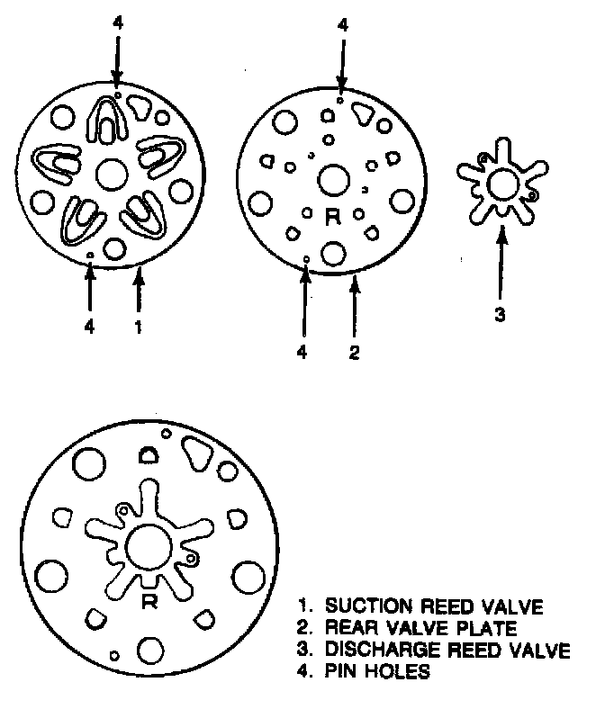 c. Install the suction need valve, rear valve plate, and discharge reed valve on to rear cylinder top. For the installation locations, refer to the drawing.