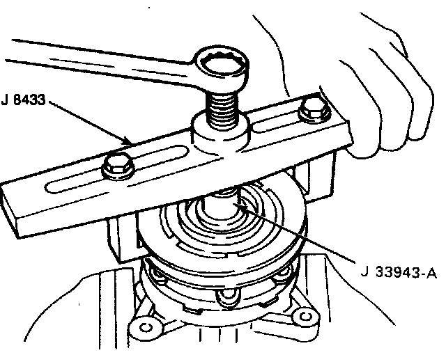 4. Remove the pulley assembly using pulley puller pilot (J 33943-A) and pulley puller (J 8433).