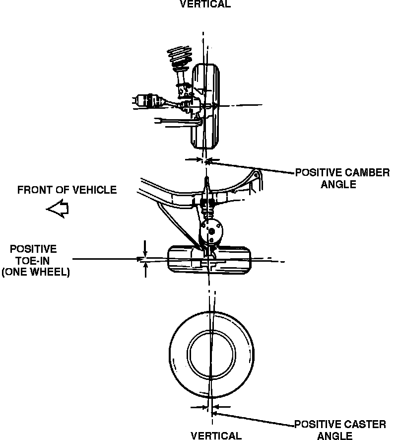 Wheel alignment, is the angular relationship between the wheels, suspension attaching parts and ground. The angle of the knuckle away from the vertical, pointing in or out of wheels, tilt of the wheels from vertical (when viewed from front of vehicle) and tilt of suspension members from vertical (when viewed from side of vehicle), all of these are involved in proper alignment, Fig. 1.