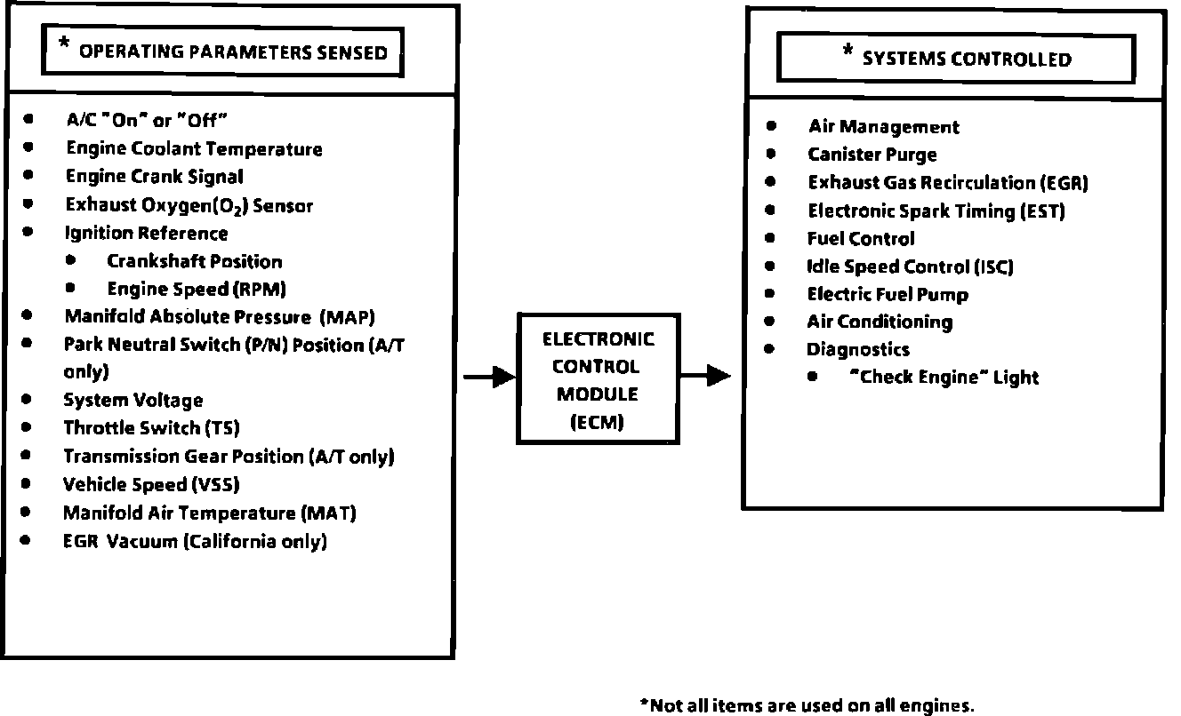 The computer command control system, which is controlled by the Electronic Control Module (ECM), is designed to maintain exhaust emission levels at federal standards while providing good driveability and fuel efficiency. The functions of the system are based on data gathered by sensors and switches located throughout the vehicle. The ECM maintains control over fuel delivery, ignition, idle air flow, the fuel pump and other system components, while monitoring the system for faulty operation with its diagnostic capabilities.
