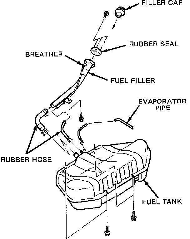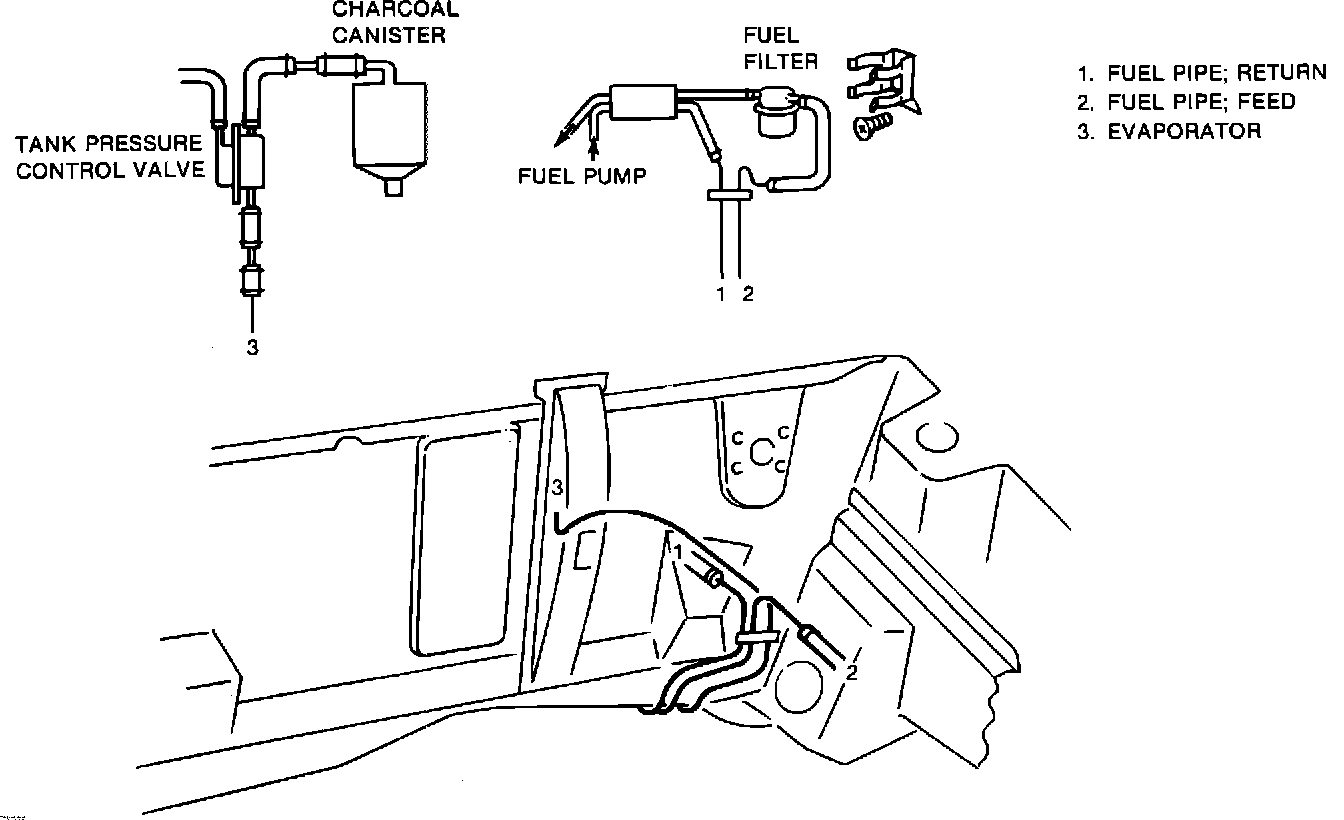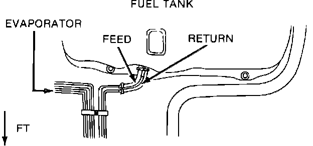 The fuel feed and return pipes extend from the fuel pump to the engine compartment. The pipes are secured to the underbody with clip and screw assemblies. Both fuel feed pipes and return pipe must be properly routed and retained, and should be inspected occasionally for leaks, kinks, or dents. If evidence of dirt is found in the fuel injector assembly or fuel filter during disassembly, the pipes should be disconnected and blown out. Check the fuel strainer on the fuel pump assembly for damage or omission.