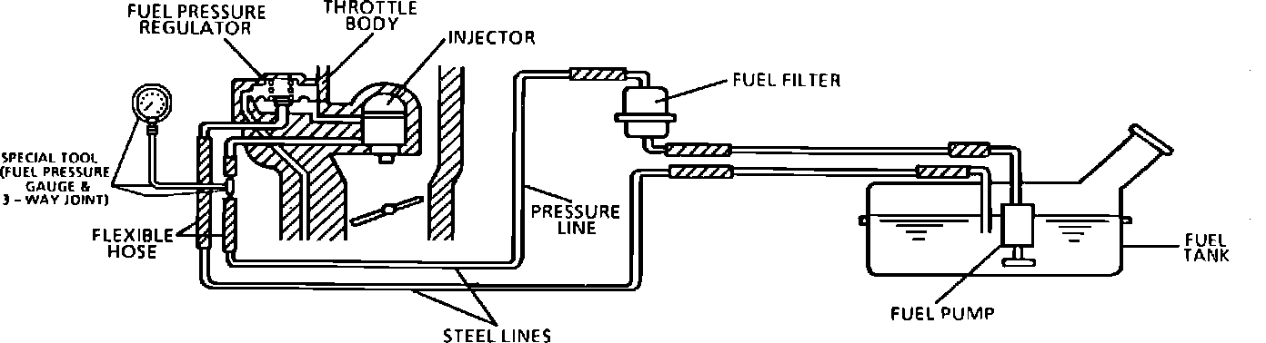 6. Restricting the fuel return line allows the fuel pump to develop its maximum pressure (dead head pressure). When B+, 12 volts is applied to the pump test terminal, pressure should be above 210 kPa (30.5 psi).