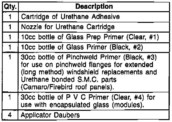 The new Urethane Adhesive Caulking Kit, GM P/N 12346284 contains some additional primers, and has broader applications than the previous kit. The contents for the new kit include as shown.