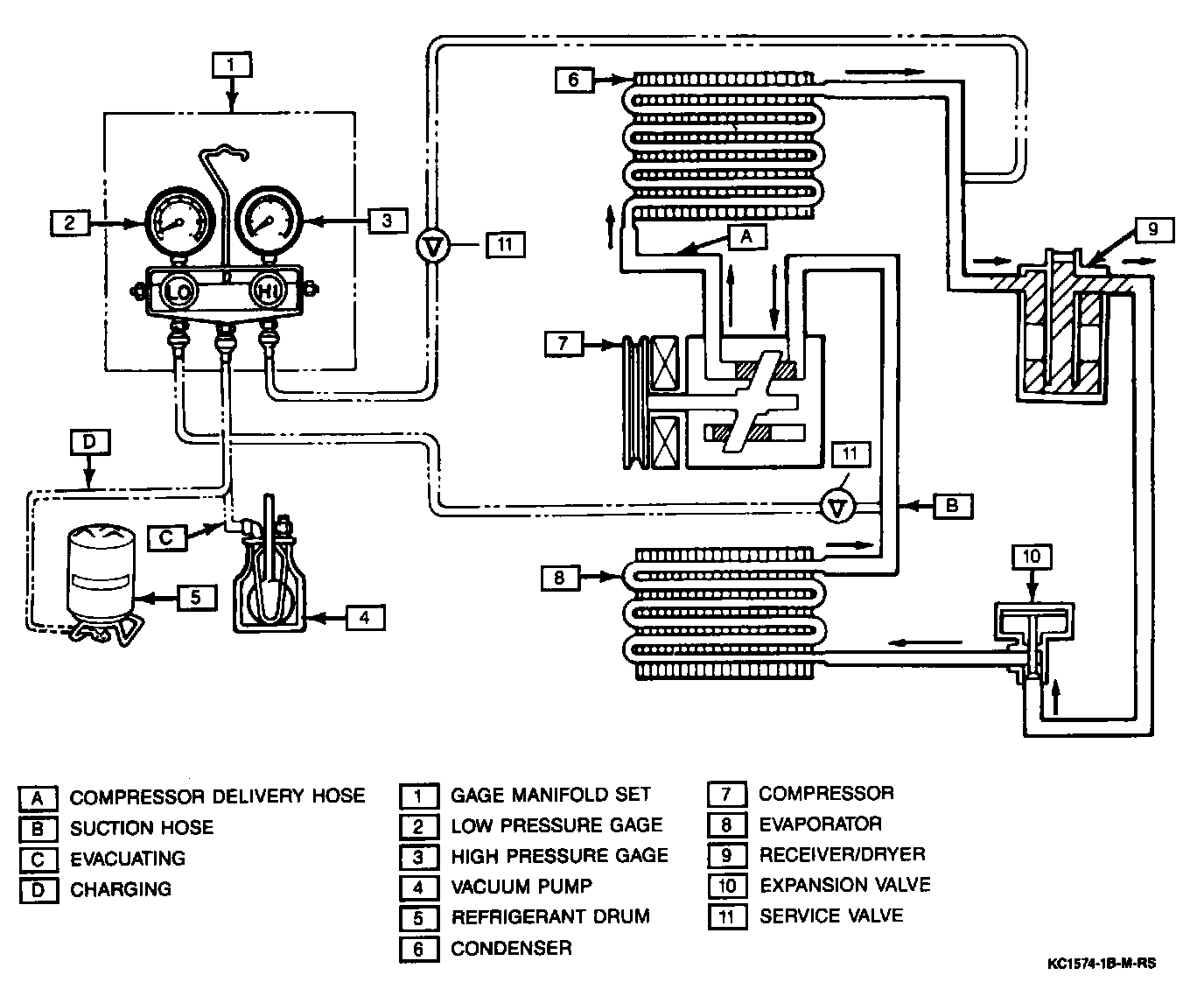 ^ If a system component has been replaced, the oil which was in the component will have to be added to the system. Drain the oil from the old component, measure the amount, and add that much new oil to the A/C system.