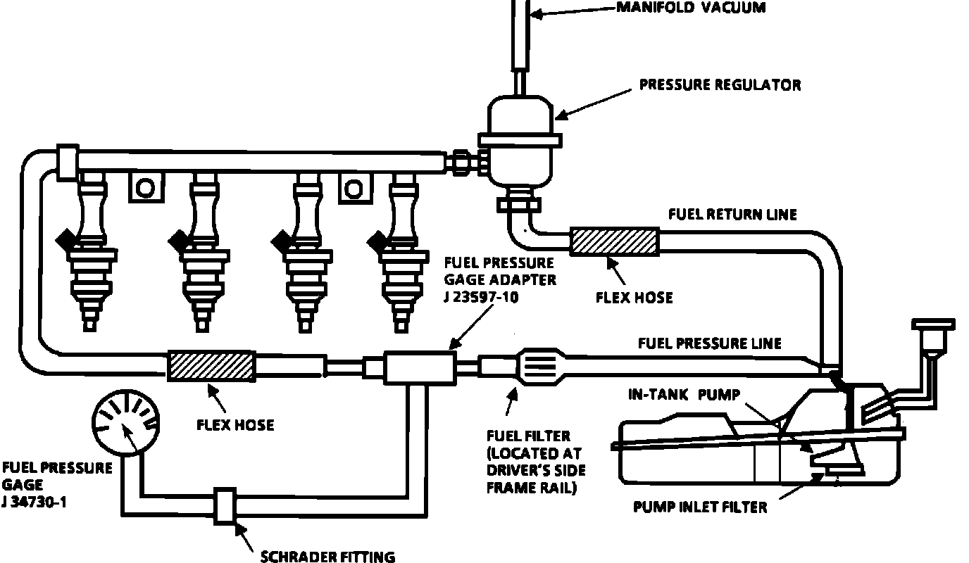 The fuel pump delivers fuel to the fuel rail and injectors, where the system pressure is controlled from 245 to 286 kPa (35 to 42 psi) by the pressure regulator. Excess fuel is returned to the fuel tank. When the engine is stopped, the pump can be energized by applying battery voltage to the test terminal located in the engine compartment.