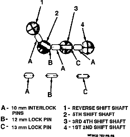 This transaxle also uses four interlock pins that are 10 mm long. Three are used in conjunction with the lock pins in the lower transaxle case. A fourth pin is located in the reverse/5th shift block. It prevents the transaxle from being shifted from fifth gear to reverse without going through neutral.