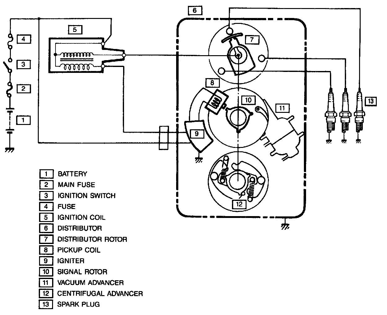 The basic components of the ignition system are ignition coil, distributor and spark plugs and those of the distributor are signal generator (signal rotor and pickup coil), igniter, rotor, vacuum advancer and centrifugal advancer.