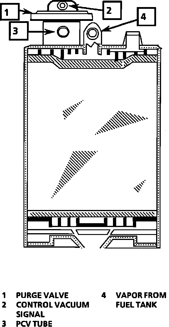 The evaporative emission control canister contains activated carbon to retain fuel vapors transferred from the fuel tank. When the engine is running, the fuel vapor is purged from the carbon element and consumed in the normal combustion process. A filter element is located in the bottom of the canister.
