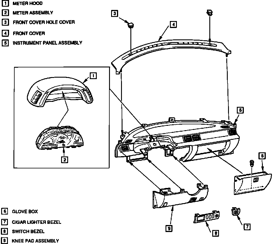 15. Remove four bolts, two screws and one nut attaching instrument panel assembly.