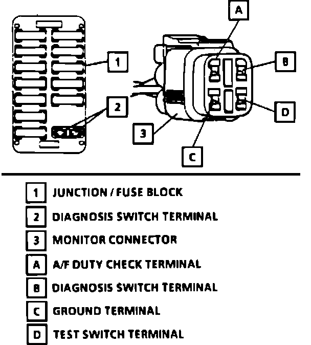 The test switch terminal is included in the monitor connector. When this terminal is grounded, the ECM sets the ignition timing to base timing. When both test switch terminal and diagnosis switch terminal are not grounded, ECM outputs A/F duty cycle through the A/F duty cycle check terminal.