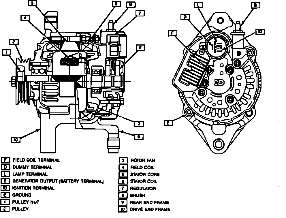 This alternator has an IC integral solid state regulator. Fig. 1. All regulator components are enclosed into a solid mold and are attached to the slip ring end frame along with the brush holder assembly. The alternator voltage setting cannot be adjusted.