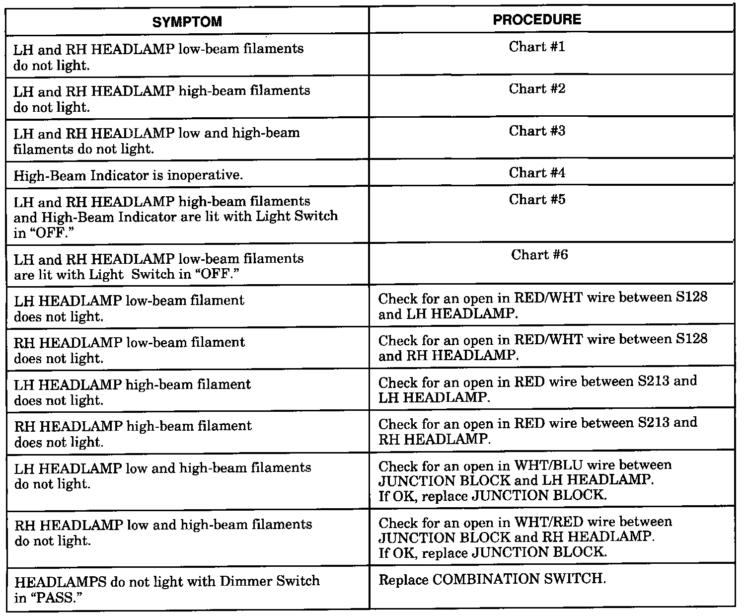 Headlights: Symptom Table:
