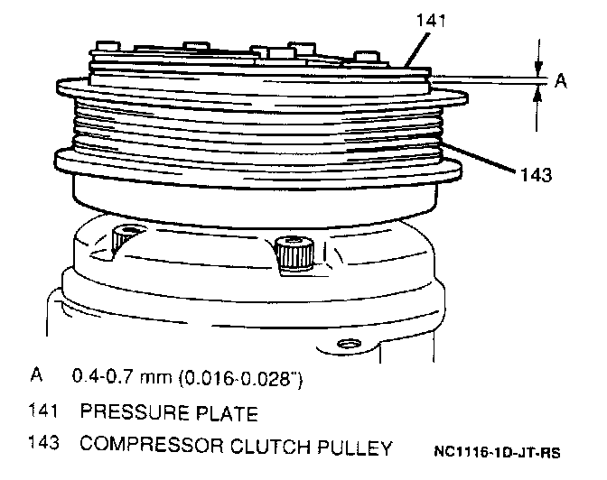 ^ Clearance between clutch pulley and pressure plate. If clearance is not 0.4 to 0.7 mm (0.016 to 0.028-inch). Remove the pressure plate and add or remove shim(s) as necessary.