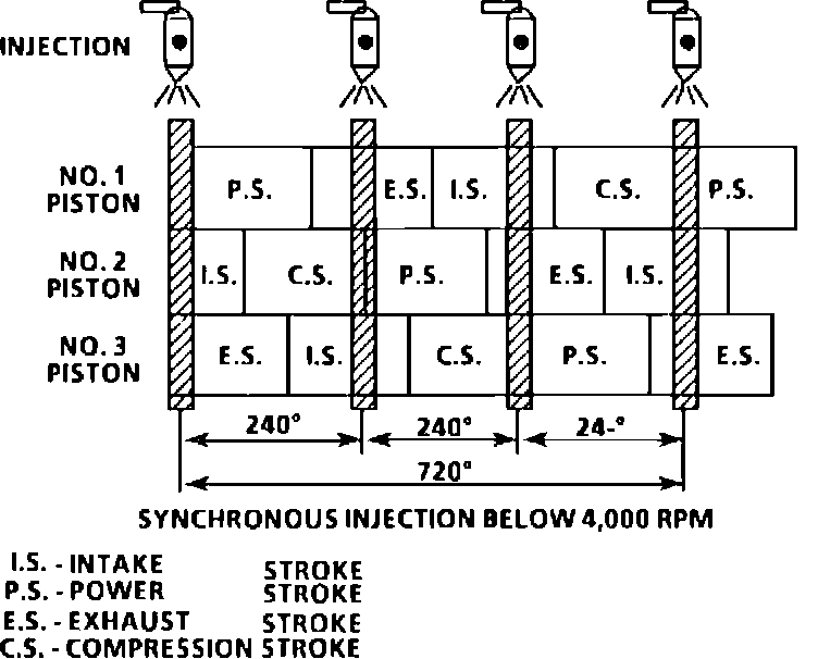 NOTE: The fuel injector is driven by its solenoid coil based upon the ECM output signal. There is some delay called "Ineffective injection time," where no fuel is provided, between the ECM signal and valve action. Since ineffective injection time depends on the battery voltage, the ECM takes voltage information to compensate for fuel injection time.Synchronous Injection At Lower Than 4000 RPM: