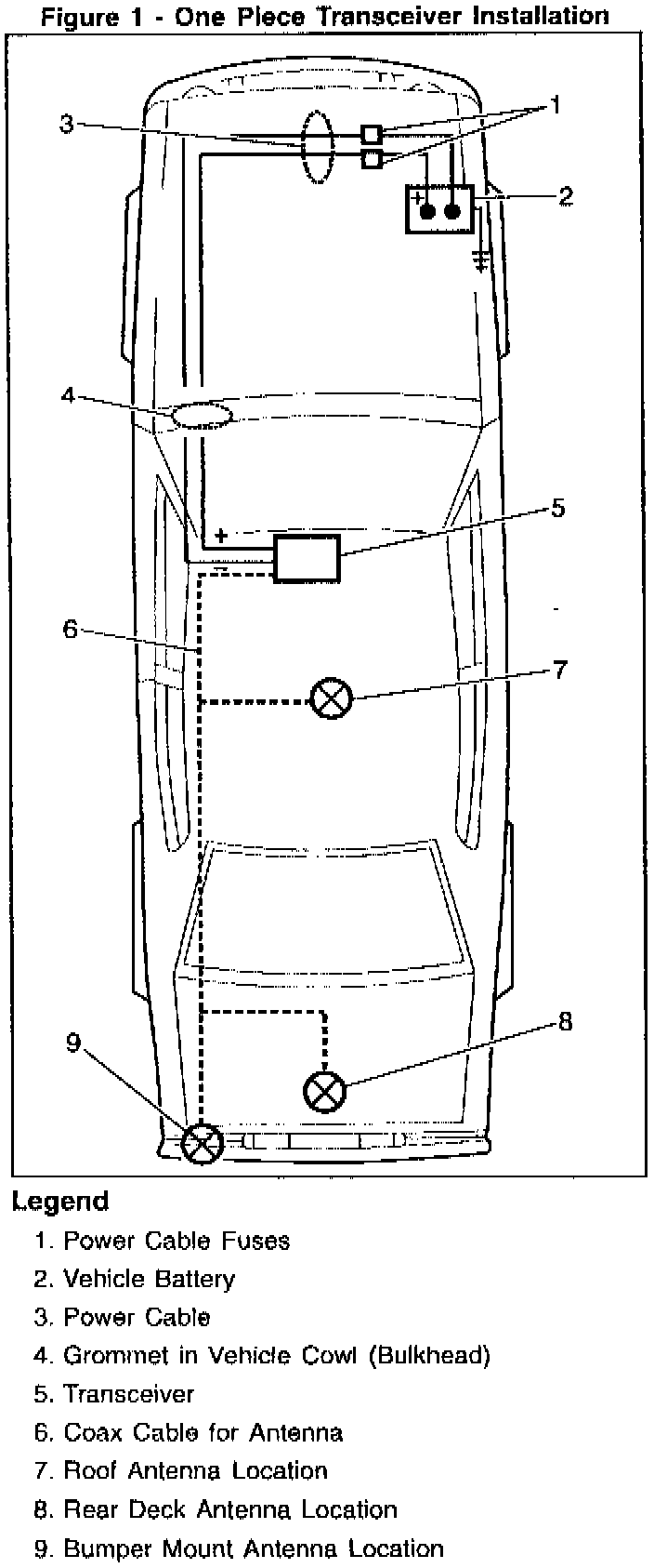 a. One piece transceivers should be mounted under the dash, or on the transmission hump where they will not interfere with vehicle controls or passenger movement (See Figure 1 - One Piece Transceiver Installation).