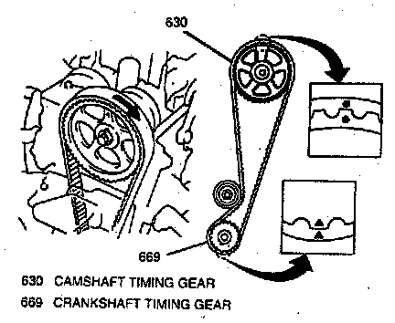 5. Ensure timing marks are aligned (figures 1 and 2) and install timing belt to camshaft and crankshaft timing gears and idler pulley.