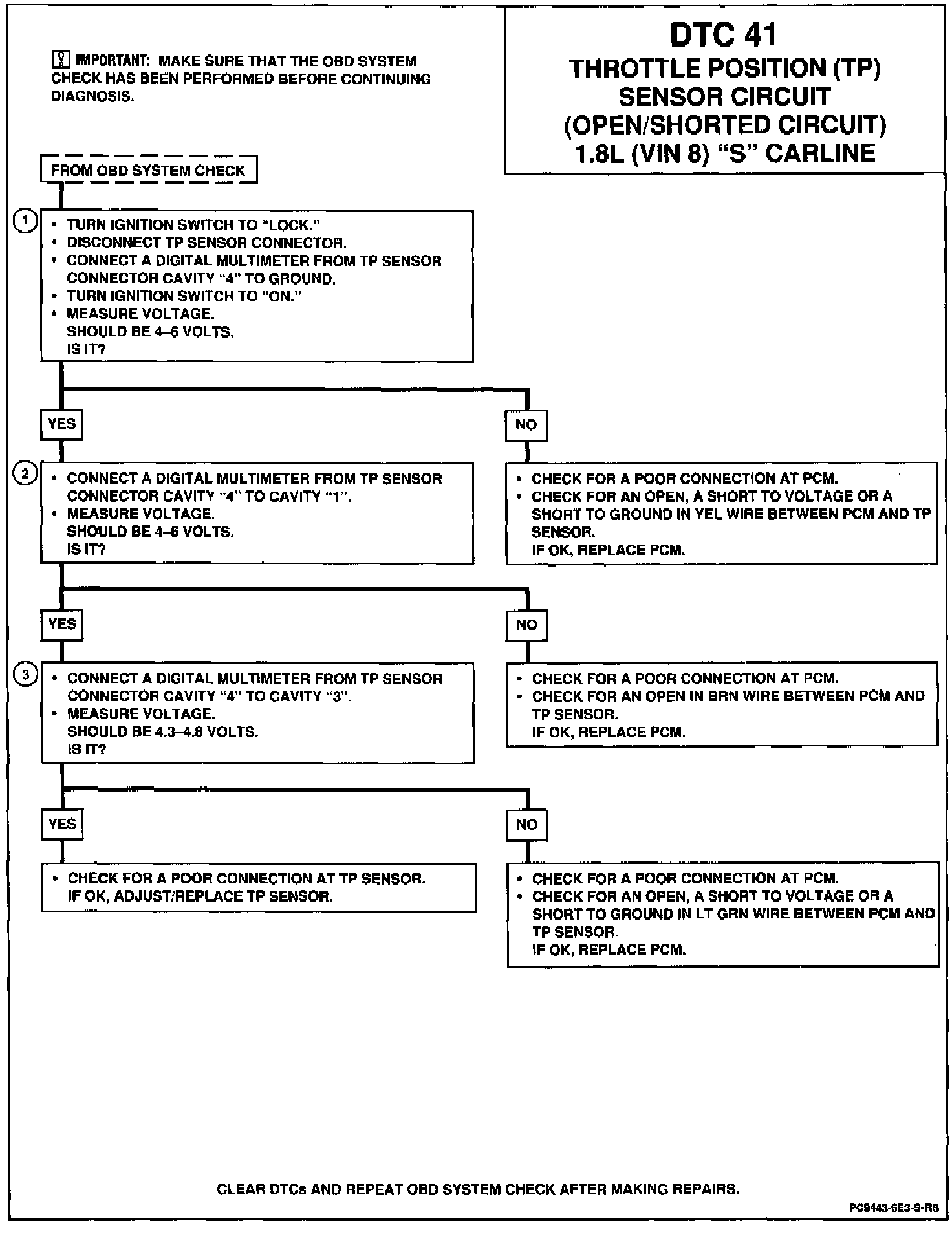 By monitoring the "ON/OFF" signal and sensor output voltage, the PCM detects the throttle valve opening. DTC 41 will set if either of the following conditions are met for at least 0.5 seconds: