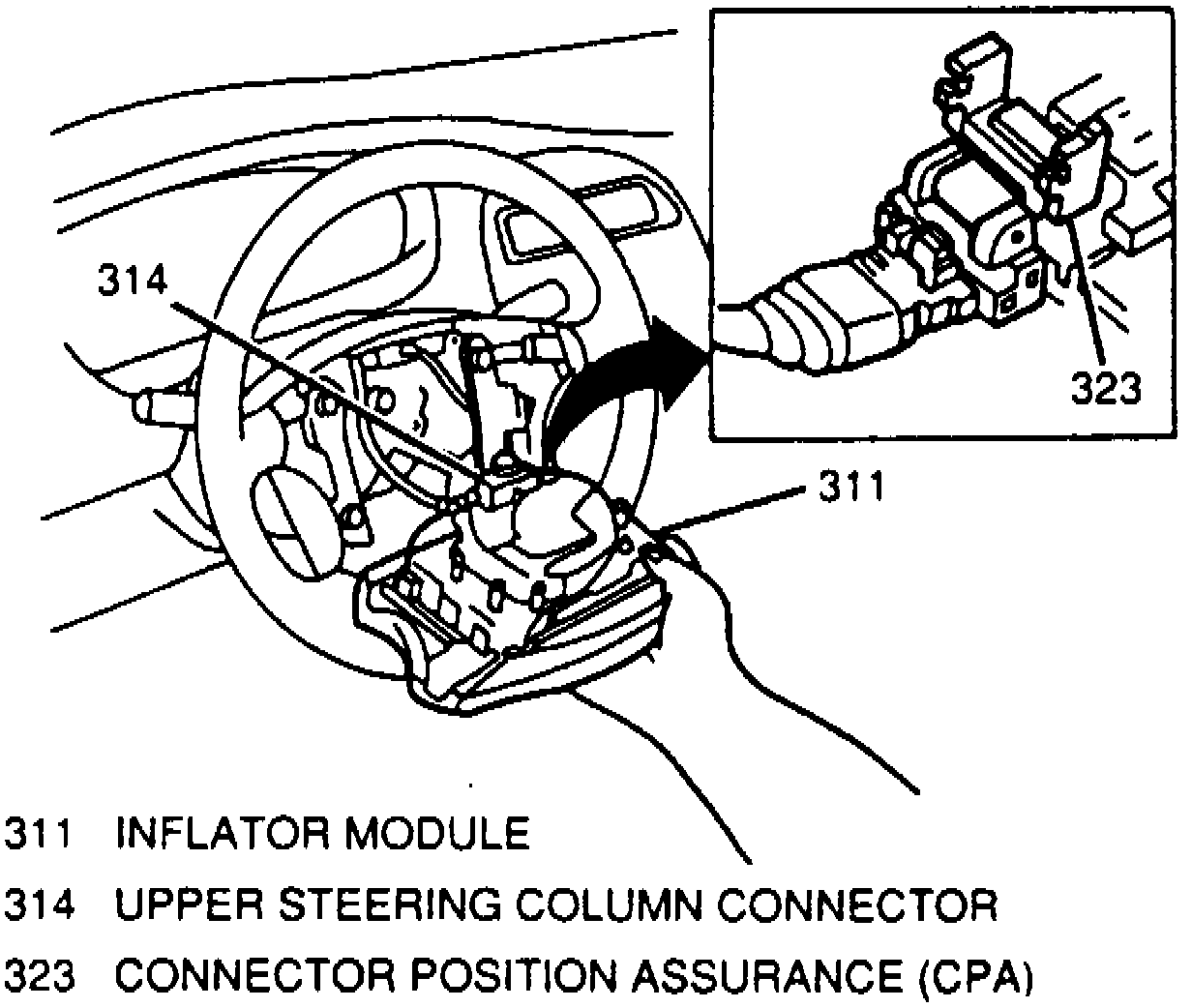 3. Remove two Torx head screws, release Connector Position Assurance (CPA) and disconnect upper steering column connector, Fig. 6 .