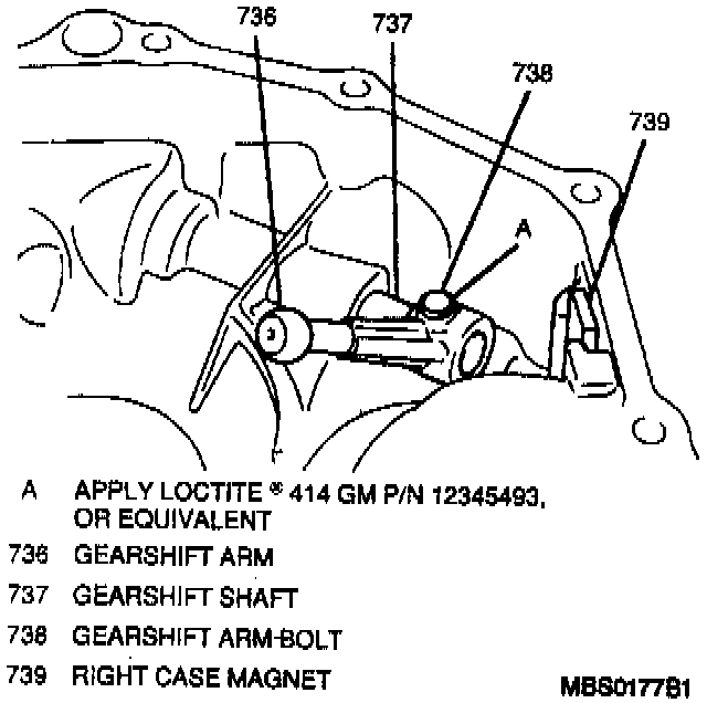 15. Apply Loctite (tm) 414 GM P/N 12345493, or equivalent, to the threaded portion of the two reverse gearshift lever bolts.