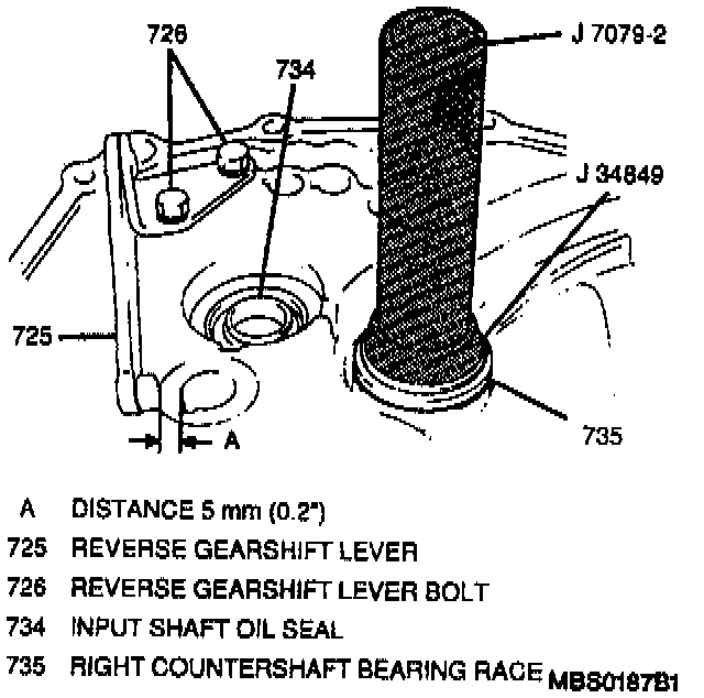 - Clearance between the reverse gearshift lever and the reverse gear idler shaft case bore. Clearance can be measured by temporarily installing the reverse gear idler shaft. Reverse gearshift lever clearance "A" should be 5 mm (0.20 inch). If reverse gearshift lever clearance is out of specification, loosen the two reverse gearshift lever bolts and adjust the reverse gearshift lever until clearance is within specification.