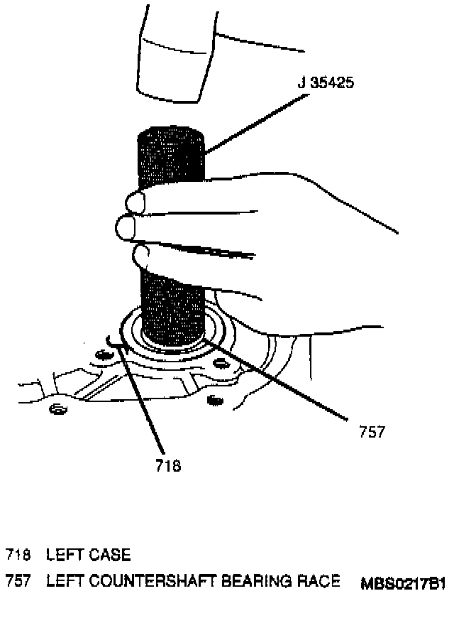 5. Left countershaft bearing race into the left case using a J 35425 and a hammer.