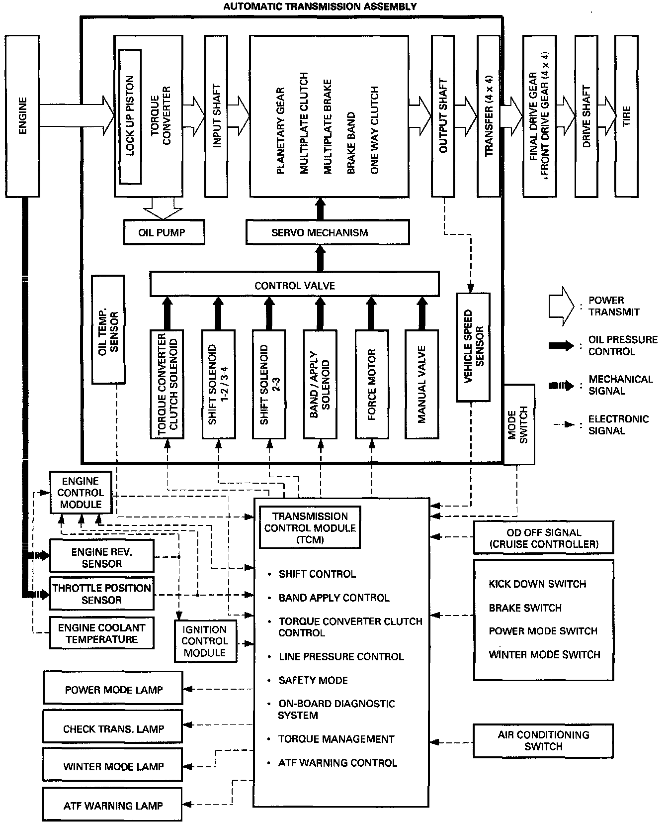 The TCM sends the absolute spark advance signal to the Engine Control Module (ECM) while the Transmission is being shifted, to control the Engine spark timing in compliance with the Vehicle running condition to reduce the shocks caused by the change of speed.