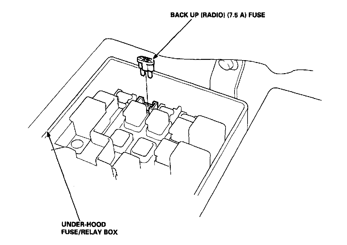 - Turn the ignition switch OFF. Remove the BACK UP (RADIO) (7.5 A) fuse from the under-hood fuse/relay box for 10 seconds.