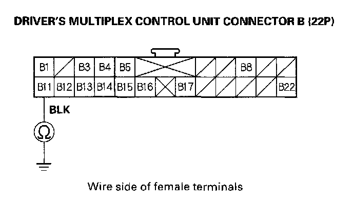 12. Check for continuity between No.11 terminal of the driver's multiplex control unit connector B (22P) and body ground.