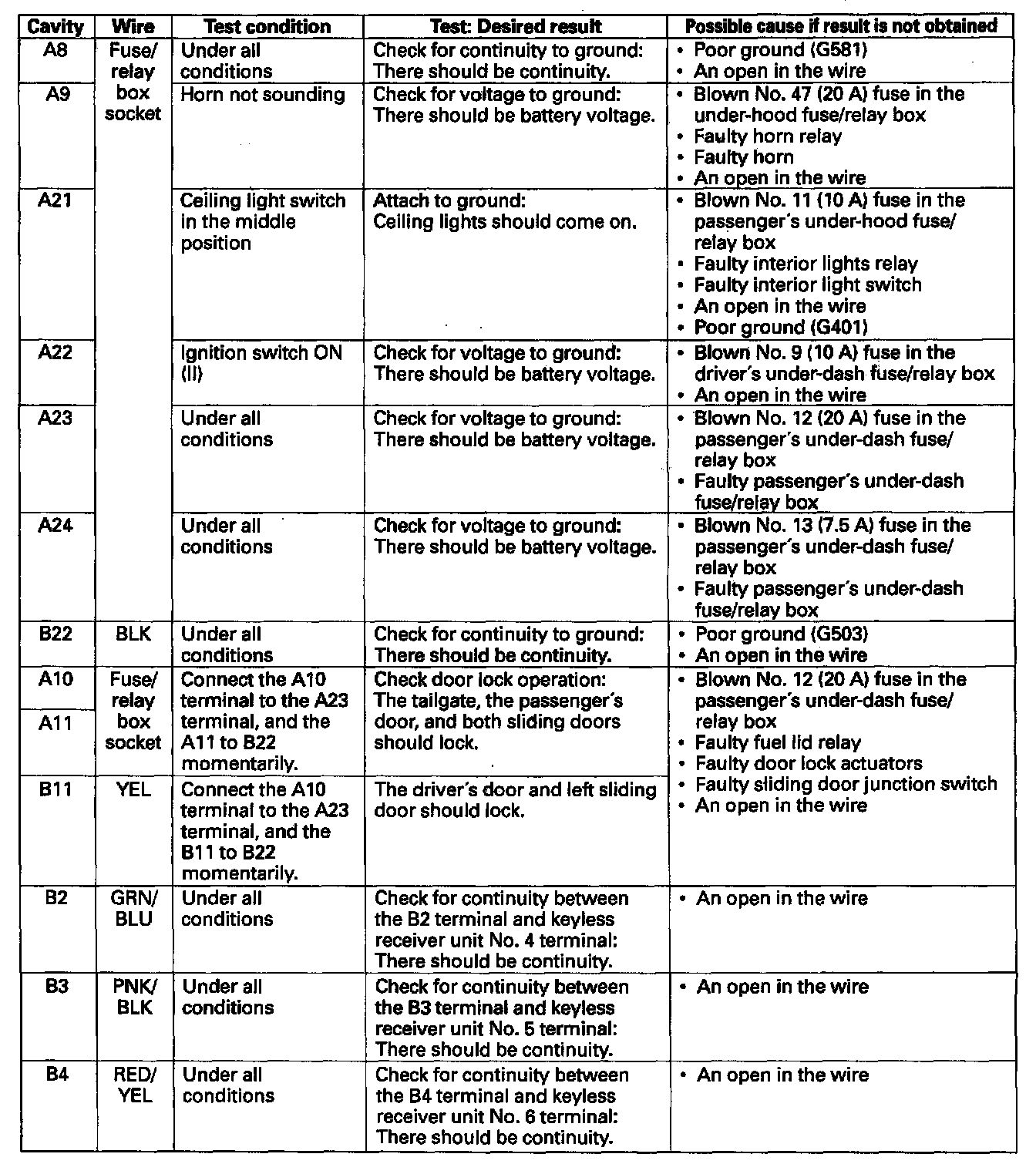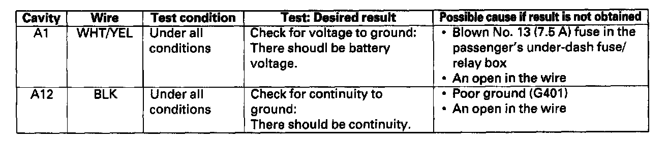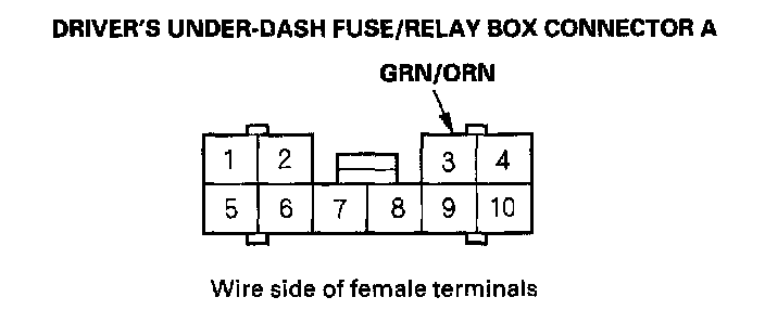4. With the driver's unit still disconnected, make these input tests at the connector and fuse/relay box sockets.