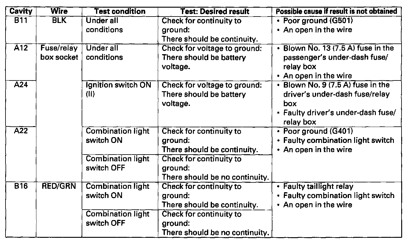 9. Reconnect the passenger's multiplex control unit to the fuse/relay box, and perform the following input tests at the appropriate connectors on the back of the fuse/relay box.
